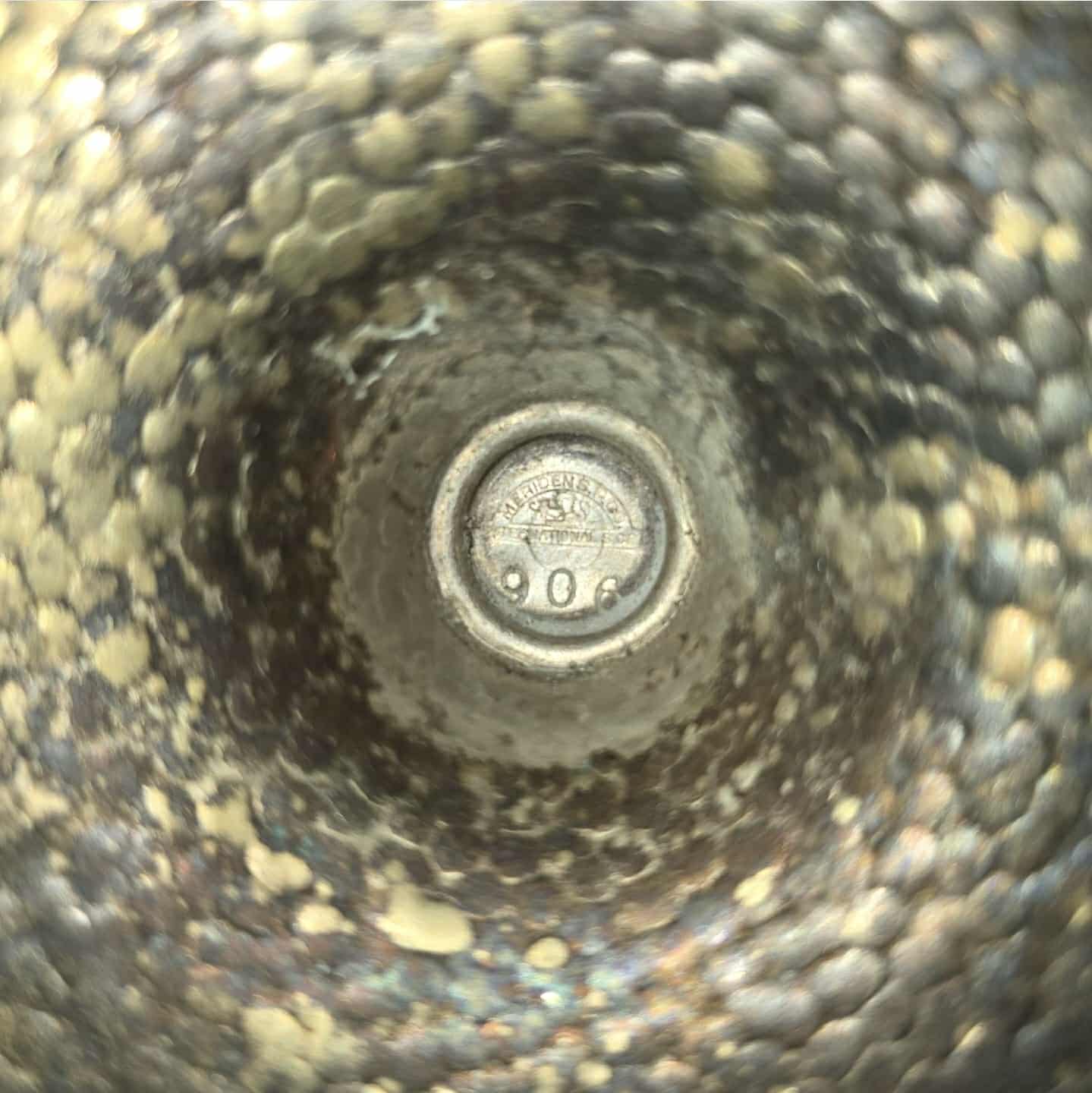 Material: Silver-plated metal with hand-hammered finish Mark: “MERIDEN S.P. CO. 906” stamped on base